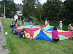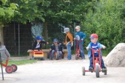 Zusätzlich gehen wir regelmäßig in den Wald oder unternehmen Ausflüge in die Gemeinde. Holprige Wege, Kletterbäume oder Balancieren auf Baumstämmen oder Seilen fördern den Gleichgewichtssinn.