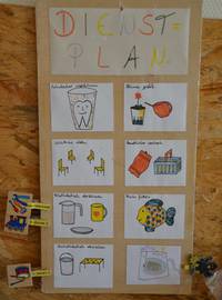 Nach dem Motto „Hilf mir, es selbst zu tun“ (Maria Montessori) vermitteln wir den Kindern lebenspraktische Anleitungen. Und dies ist nicht nur Schuhe binden, Zähneputzen oder unser „Kinderdienstplan“. Das Gefühl „Ich kann das schon“ steigert ihr Selbstbewusstsein und macht sie stark.